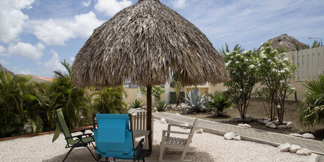 Our tropical gardens are attractively landscaped. You have access to a large private saltwater pool where you can swim in the pool, the pool lends itself well to this, with benches for sunbathing and two lovely lounge corners for shade with quiet background relaxing music. Of course we have internet everywhere this is completely free and we also have a good secure wifi connection throughout the resort.